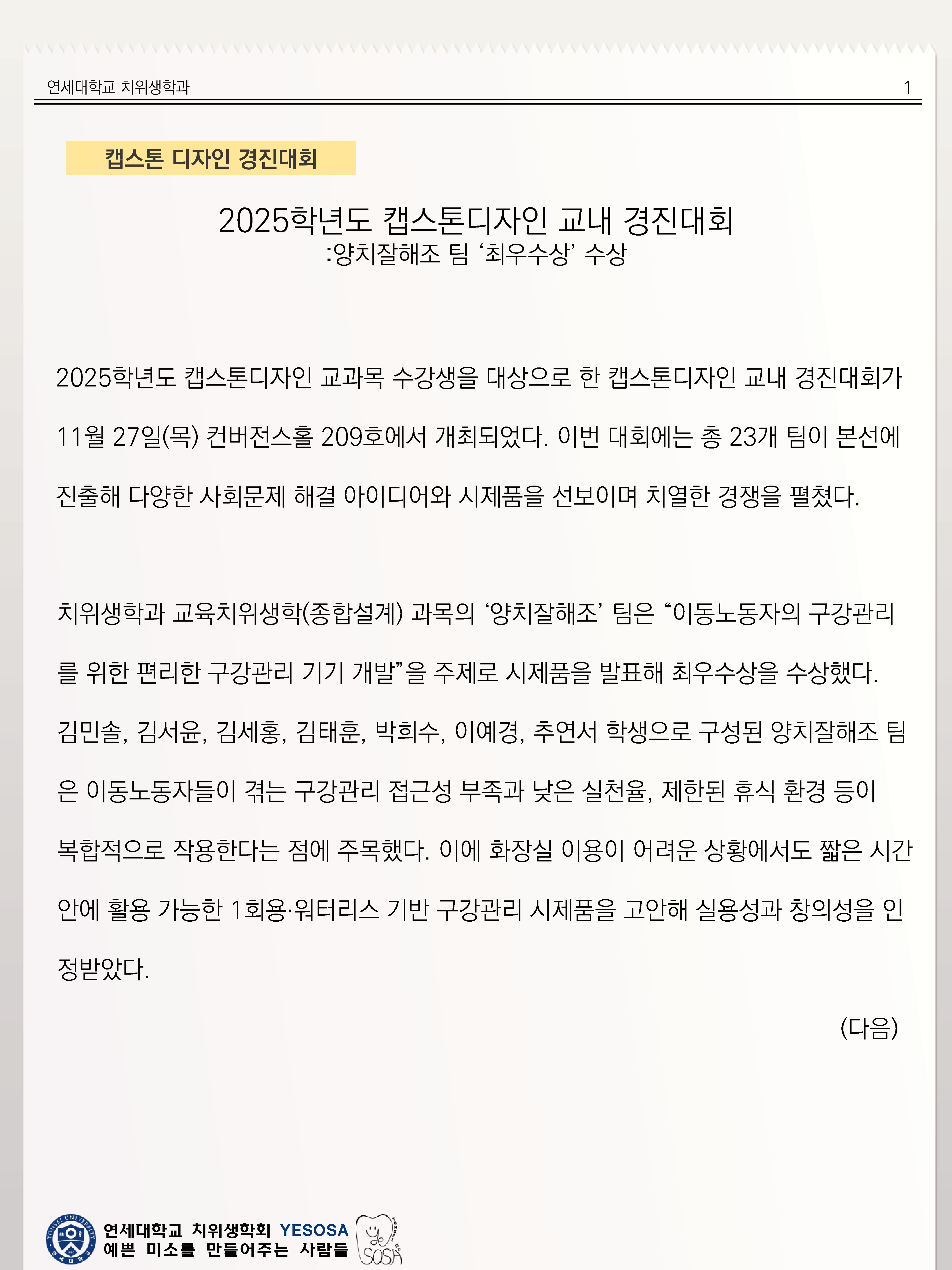 [2025-16] 2025학년도 캡스톤디자인 교내 경진대회: 양치잘해조 팀 '최우수상' 수상